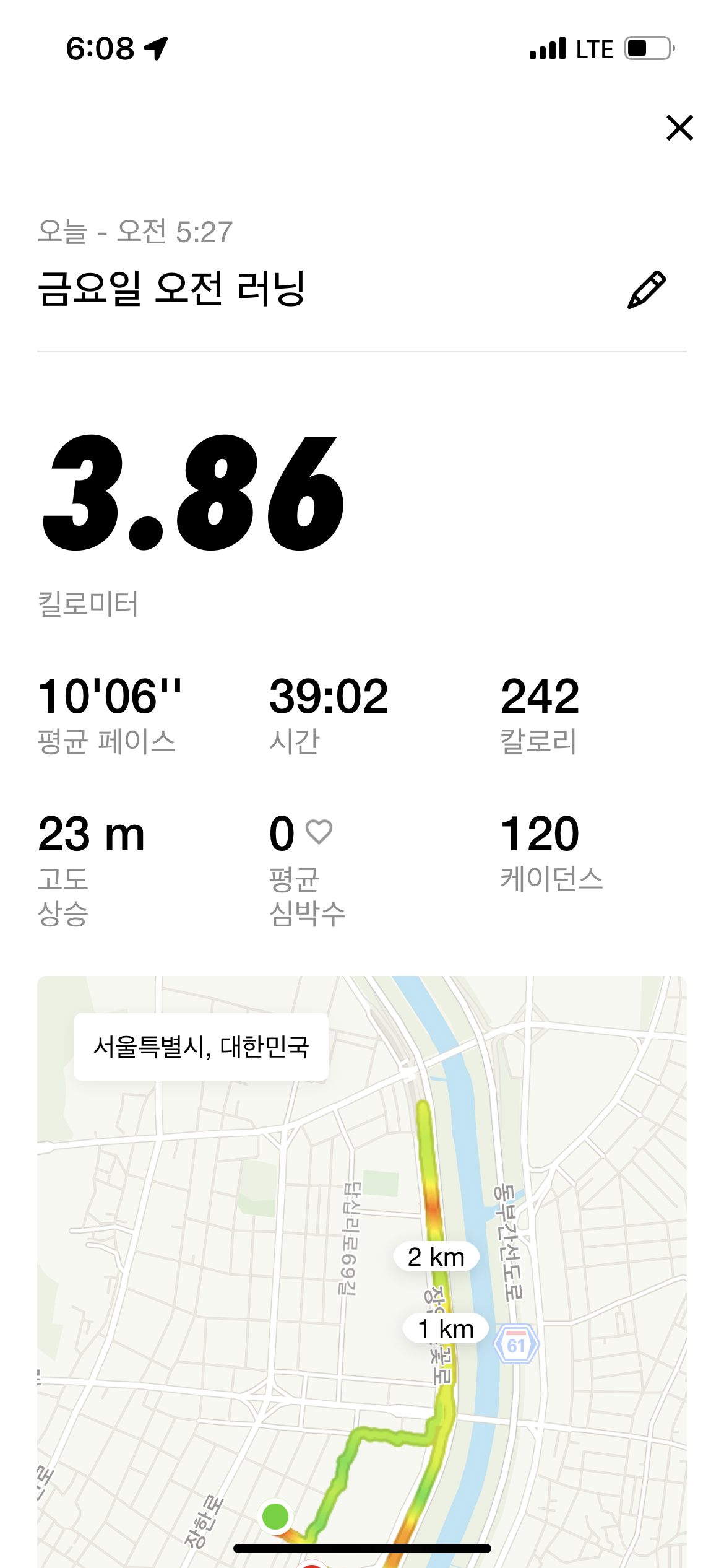 오늘은 조깅을 끝내고 편의점에서 머물려서 .. 키로당 10분이나. 기록 되었지만 9분 정도나오는 것 같다.